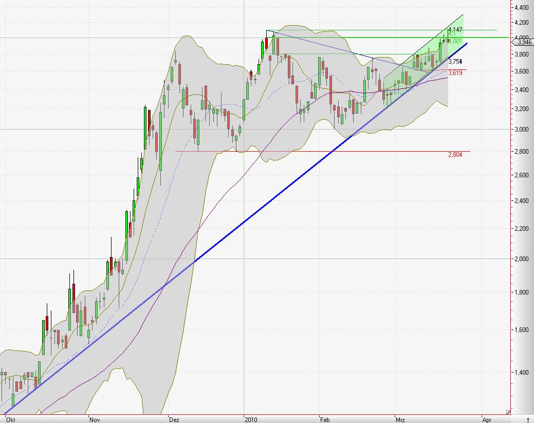 stürmt über 4 eur als wärs nix sogar bis auf ein neues 52 Wochen hoch bis 4,11 eur und fällt dann wieder 4 % auf tages und wochenschluss 3,946. wieder nix mit 4 eur.