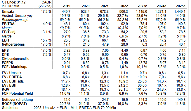 Fazit: Adesso bleibt weiter auf Wachstumskurs und will im kommenden Jahr wieder durchstarten und überdies die Margen steigern. Die Prognosesenkung Anfang November führte zu keinem weiteren Abverkauf mehr. Dies deutet darauf hin, dass sich die Börse auf das wieder anziehende Wachstum im Jahr 2024 konzentriert. Klar ist, dass, trotz der pessimistischen Stimmung in Europa, langfristig kein Weg an IT-Automatisierungsprojekten vorbeiführt. Adesso dürfte hiervon mittelfristig, dank der starken Marktstellung, besonders stark profitieren.