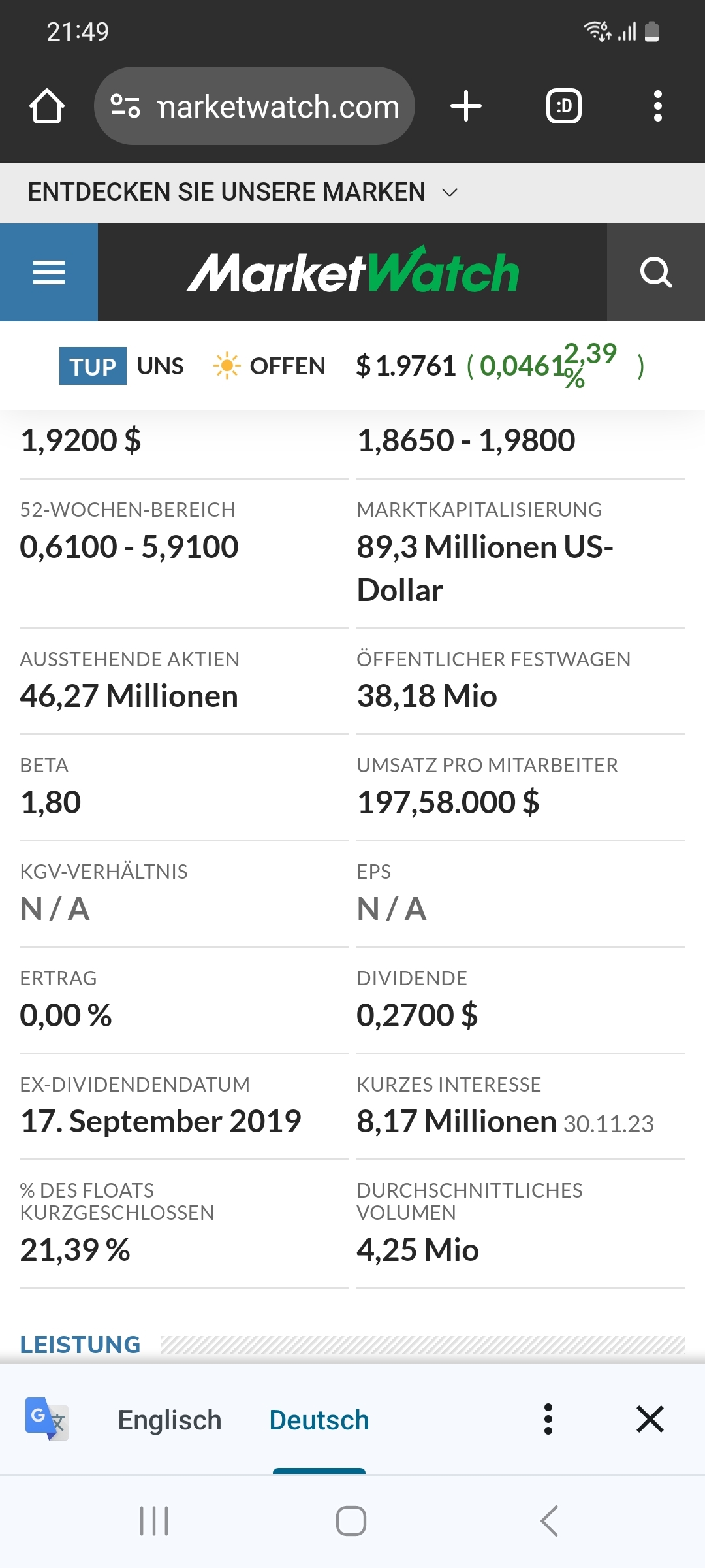 Gefällt mir wenn die Shortquote zurückgeht, das sagt mir dass die vorsichtiger werden und ggf. doch spekulieren, dass der Turnaround klappen kann. Ist zwar noch zu früh, aber wenn die Quote permanent zurückgeht ist schon ein gutes Zeichen. Schade dass es Verkäufer gibt die zwischen 1.7 und 1.9$ die Aktien jetzt schon abgeben. Denke hier ist mehr drin.