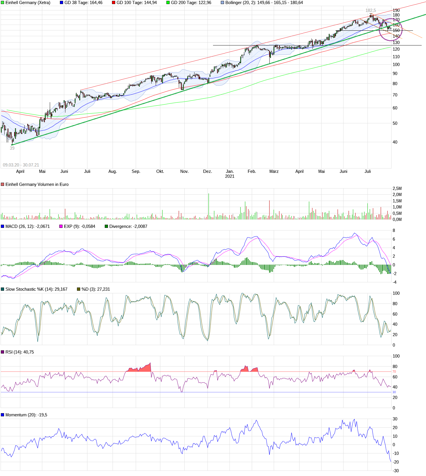 Der Aufwärtstrend seit dem Corona-Crash ist mit der letzten Woche sowohl im Tages- als auch im Wochenchart formell gebrochen worden. Aber was bedeutet das? Das kommt auf die Rahmenbedingungen an. Meistens verlaufen Kurse in Kurven. Und Kurven flachen zum Hochpunkt hin eben ab. Also verlässt der Kurs den Aufwärtstrendkanal schon vor dem Hoch. Insofern ist der Bruch des Trendkanals noch kein Grund zur Panik. Zumal man die Einflüsse des Gesamtmarkts hier mit berücksichtigen muss. Seit einiger Zeit konsolidieren die Märkte. Einhell hat sich hier zwischenzeitlich sogar dem Markt entgegen gesetzt. Seit Anfang Juli konsolidiert aber auch Einhell. Und in dem aktuell gen Süden tendierenden Markt (dank den Verunsicherungen aus China) kann der Trendbruch sogar bei zurückkehrendem Vertrauen wieder negiert werden (was nicht heißt, das ich davon ausgehe).