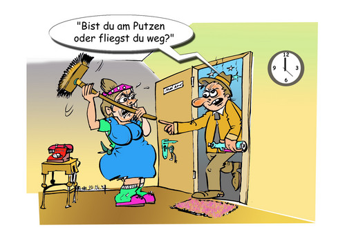 Als seine Frau ihn dabei überholt, sieht er sie beim Aufblicken von hinten und ruft: "Traudl, Du hast ja keine Unnerbüchs an!"