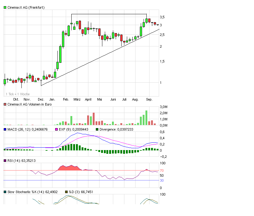 Charttechnik ist das Zusammenspiel aus Psychologie und Fundamentalanalyse. Und man sucht damit keine Kursziele, sondern man befolgt Handelssignale. Den Unterschied werden die Kritiker der Charttechnik wohl nie begreifen, und nur deshalb lehnen sie sie ab. Also beschäftige dich mal damit, und dann reden wir weiter! Und wie kann man Charttechnik eigentlich gerade bei Cinemaxx ablehnen, wo sie bisher so perfekt funktioniert hat, wo es so klare Trends und Signale gab, die einem hier erhebliche Verluste erspart und Gewinne gebracht hätten? Ist mir ein Rätsel, wie man diese Tatsache ignorieren kann, nur weil man sich irgendwann mal in den Kopf gesetzt hat Charttechnik zu hassen.