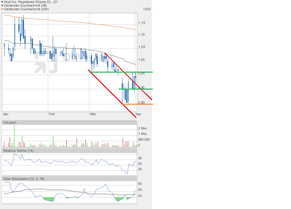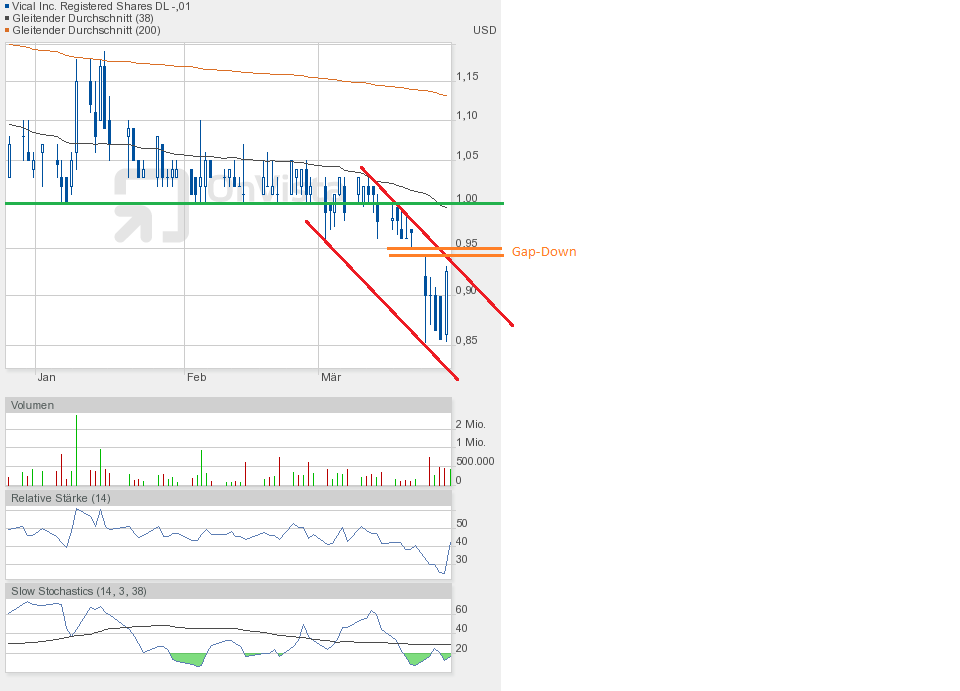 Damit bewegt sich die Aktie weiter in der Range 0,90$-0,96$. Kurzfristig lässt sich übergeordnet ein bearisher Keil darstellen, orange eingezeichnet. So könnte man für nächste Woche eine Konfrontation mit der 38-Tage-Linie erwarten. Frohe Ostern!