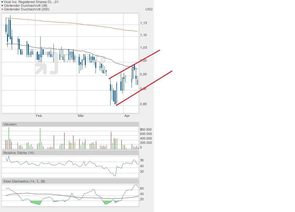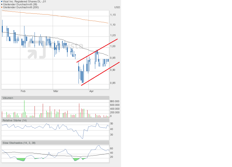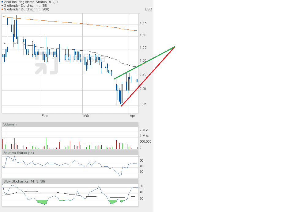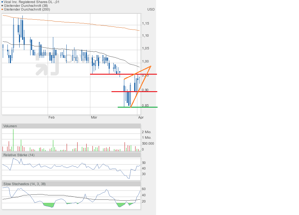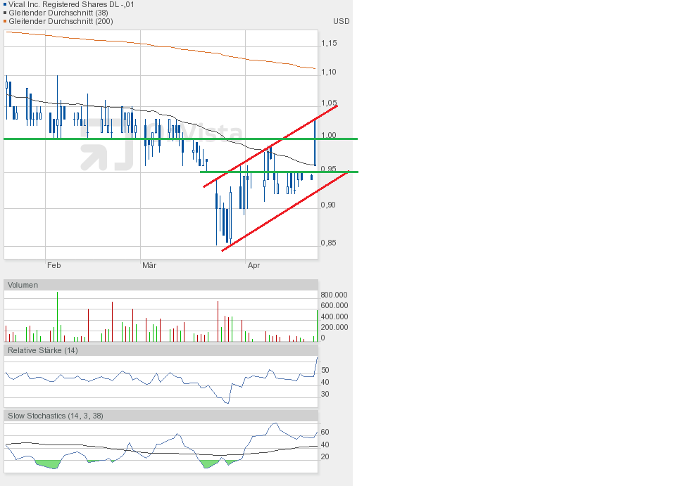 Man musste sich schon die Augen reiben, aber Vical kann doch noch Tagesrallye. Bei 0,85$ kam die Wende schon recht zeitig, dann drehte der Kurs bis auf 0,93$ auf. Schlusskurs 0,92$ mit überdurchschnittlichem Volumen von knapp 500000 Aktien.