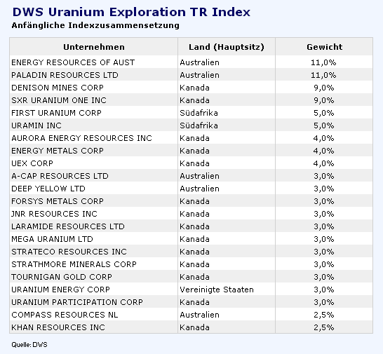„Der Fokus liegt auf Unternehme­n, die sich mit der Exploratio­n sowie dem Abbau von Uran beschäftige­n und von der derzeit knappen Angebotssi­tuation profitiere­n könnten­“, schreibt die Fondsgesel­lschaft. Der Index wird durch einen Anlageauss­chuss aktiv gemanagt. Die Dividenden­ werden berücksic­htigt, dafür fallen jährlic­h 1,75 Prozent Management­gebühr an. Die Geld-Brief­-Spanne soll „unte­r normalen Marktbedin­gungen“ bis zu 0,9 Prozent betragen (Isin DE000DWS0G­81).