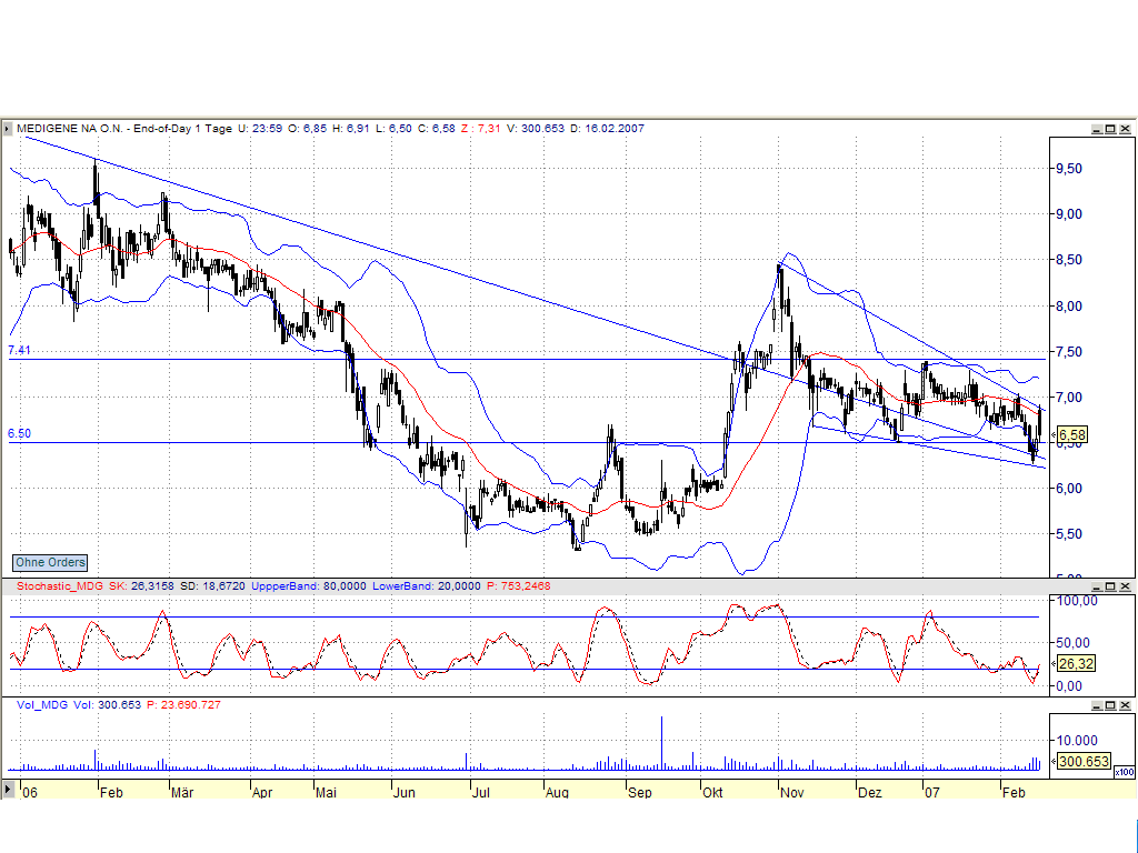 Von der US-Zulassungsbehörde hat Medigene die Marktzulassung für die „Polyphenon E-Salbe“ zur Behandlung von Genitalwarzen erhalten. Die Markteinführung durch den US-Partner Bradley Pharma sei für das zweite Halbjahr 2007 geplant, sagte der Finanzvorstand von Medigene, Alexander Dexne, gegenüber den Autoren von Tradecentre. Ferner plant der Vorstand in Europa den Aufbau einer eigenen Organisation zum Vertrieb von Polyphenon E und Oracea, einem Medikament zur Behandlung von Hautkrankheiten. Fazit von Tradecentre: Biotechs sind an der Börse voll im Trend. Mit Hinblick auf die Produktpipeline und im Vergleich zu anderen deutschen Biotechs ist Medigene mit einem Börsenwert von rund 200 Millionen Euro ein Schnäppchen und daher spekulativ kaufenswert.