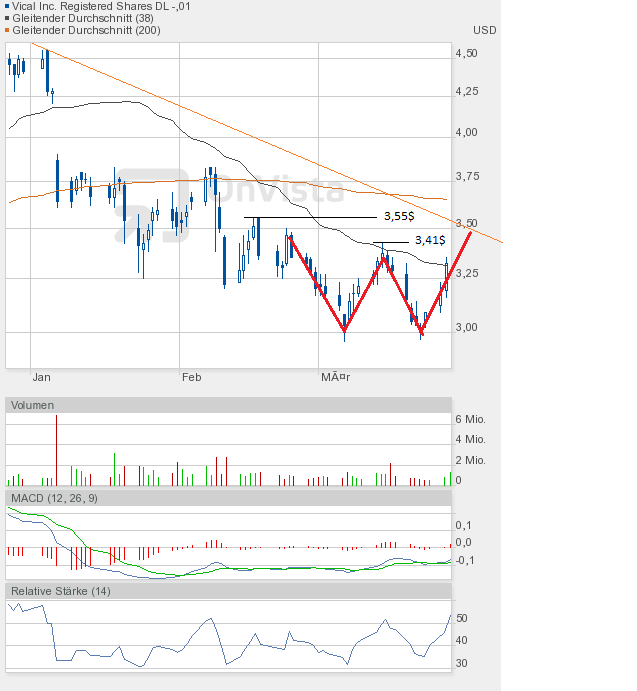 Und dabei gelang etwas, was der Vical-Aktie seit Jahresbeginn nicht mehr gelungen war. Ein Schlusskurs über der 38-Tage-Linie. Schlusskurs 3,32$. Immerhin +4,5%. Und innerhalb der letzten drei Handelstage sogar ein Zuwachs von über 10%. Der Morning Star zeigt seine ganze Wirkung. Und das mit Doppelboden und Untertassen-Formation.