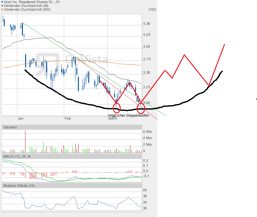 Wie ihr wisst, schon bevor sich der Morning Star bildete, erhoffte ich mir eine W-Formation. Diese ist nun in vollem Gange. Auch wenn ich schon davor von steigenden Kursen ausging, und dies nicht eintrat, da sich Kaufsignale als Fehlsignale heraus stellten, suchte ich nach neuen charttechnischen Umkehrsignalen. Und so entdeckte ich die Untertassen-Formation. Diese scheint richtig interpretiert zu sein. Ich habe kein Software-Programm, welches mir irgendwelche Signale anzeigt. Das soll keine Klugscheißerei sein. Ich finde es nur einfach genial, wenn man etwas sieht, und es tritt dann tatsächlich ein. Ich bin schließlich kein Profi. Ich lasse mich auch nicht von anderen beeinflussen. Herr Cohen von SeekingAlpha sah die Vical-Aktie Richtung 2,50$-2,70$ absacken. Ich sah es bekanntlich anders - und es kam die Untertasse, und der Doppelboden, und der Morning Star und das Kaufsignal im MACD und RSI noch dazu. Und der MACD liegt trotzdem noch weit im negativen Bereich. Also alles zusammen gesehen steht uns eine gewaltige Kursrallye ins Haus - wenn die W-Formation nach oben aufgelöst, und die orangene Widerstandslinie überwunden wird.