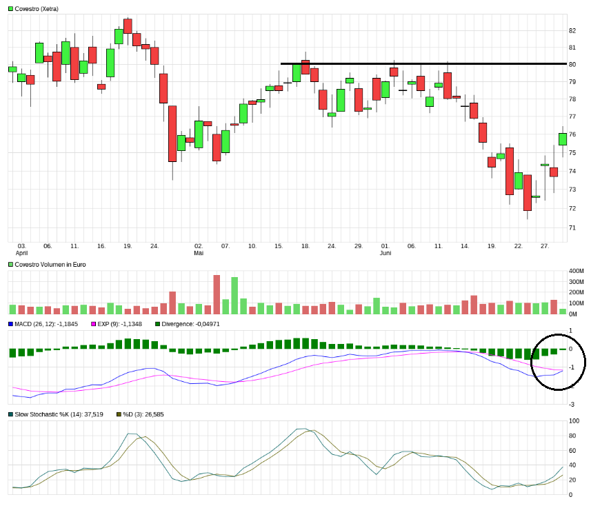 Auch Covestro entwickelte sich heute sehr gut und könnte in den kommenden 1-2 Tagen ein starkes Kaufsignal ( MACD )im kurzfristigen betrachteten Chart (3 Monate) liefern.