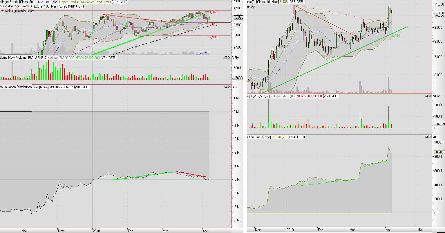 charttechnisch steht verbio momentan nicht auf der sonnenseite. im wochenchart wurde die doji letzte woche diese woche durch eine rote kerze bestätigt. damit ist die umkehrformation fertig, falls man an sowas glaubt. auffällig ist auch die distribution. die bullishe divergenz der konsolidierung von mitte januar bis mitte märz wurde nicht durch einen ausbruch aufgelöst (trotz auktionärspusherei) sondern ging in eine bearische divergenz über, die sich diese woche scheinbar beginnt aufzulösen. sprich das geld welches von januar bis märz trotz kursabfall vom 4 eur auf 3,50 eur rein geflossen ist, ist jetzt trotz anstieg auf 4,20 eur schon wieder raus. der anstieg am fr hatte auch nur ein sehr geringes volumen.