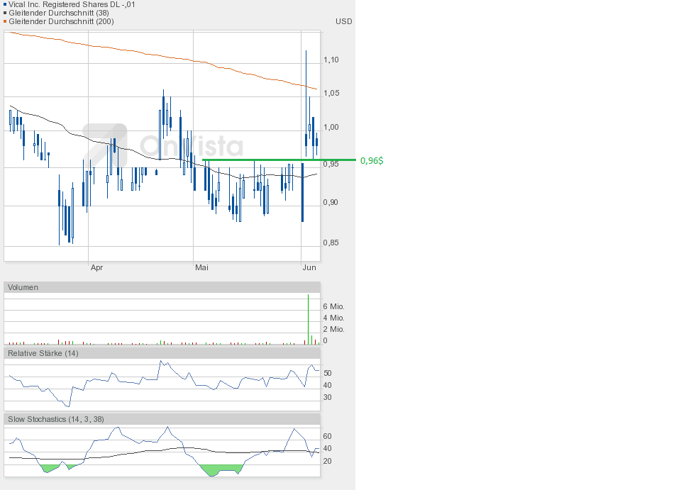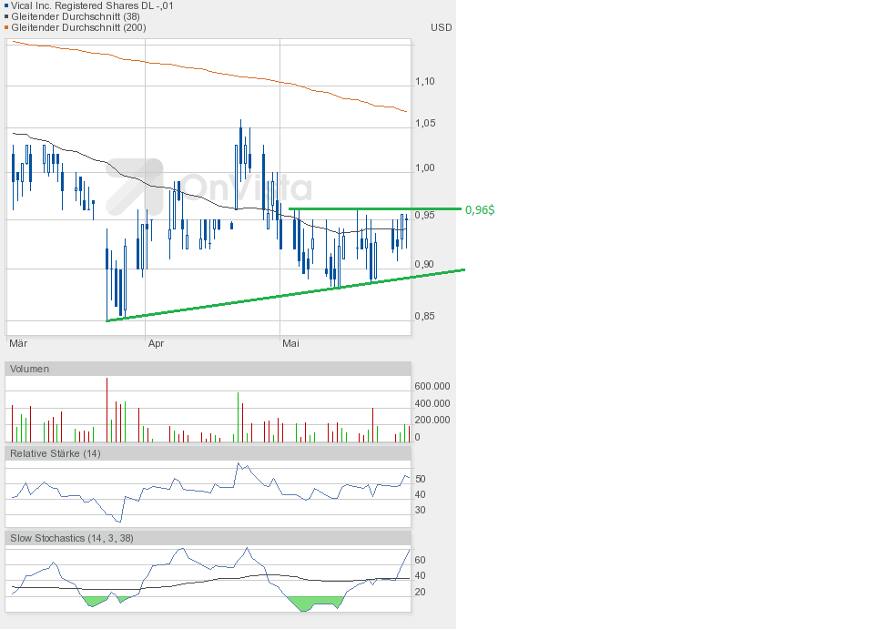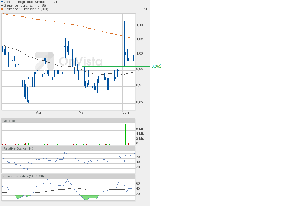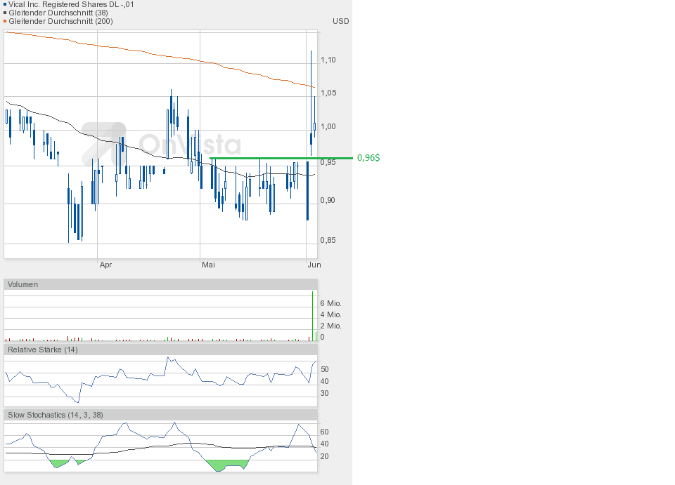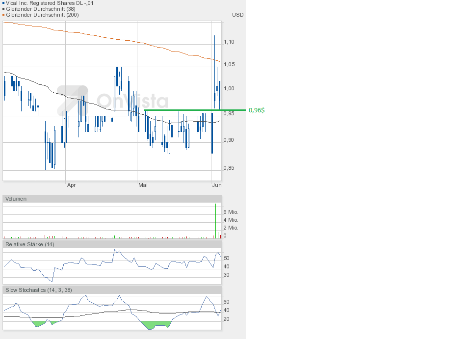 Heute konnte Vical die gute Ausgangsposition nutzen und weiter zulegen. Schlusskurs 1,02$ auf Tageshoch und höherem Volumen von etwa 750000 Aktien.