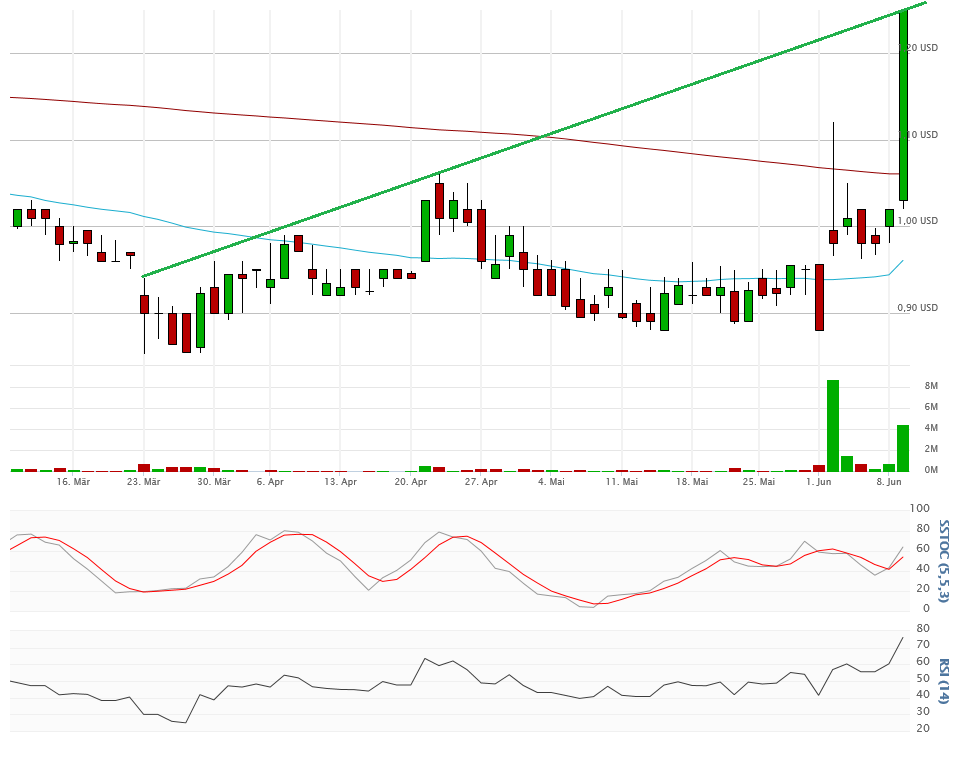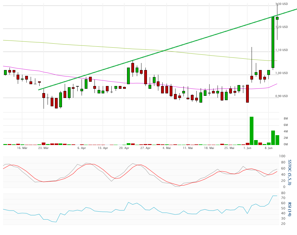 Durch den wirklich tollen Anstieg gestern bis auf 1,25$, +23%, Volumen wahnsinnige 4,5Mio Aktien, der wie am Vortag auf dem Tageshoch endete, steigt aber die Gefahr von Gewinnmitnahmen deutlich an. Nach dem neuen 5-Monats-Hoch könnte die Rallye noch bis 1,40$ anhalten, hier liegt nämlich der nächste Querwiderstand und meine bekannt ausgemachte Schlüsselmarke. Im Chart zu sehen, kann es aber schon heute etwas ungemütlich werden. Damit will ich kein Untergangsszenario malen, aber man sollte sich nicht wundern, wenn es mal 10% wieder zurück geht. Im Chart zu sehen, ist die Aktie an einem wichtigen Punkt angekommen, an der Aufwärtstrendlinie, die am 23.März ihren Anfang fand.