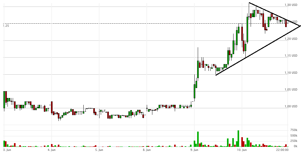 Hier ist ein weiterer Chart, der für den heutigen Tag weiter für Spannung sorgt. Zu sehen sind die letzten sechs Handelstage, wobei eine Kerze für 15min steht. Nach dem gestrigen Wochenhoch von 1,31$ befindet sich die Aktie in einem Konsolidierungsmodus. Dabei läuft dies in einem Dreieck ab, was sich seit vorgestern abgezeichnet hat. Dieses Dreieck wird heute definitiv aufgelöst. Aber in welche Richtung? Geht es nach oben, stehen die Chancen für neue Hochs sehr gut.