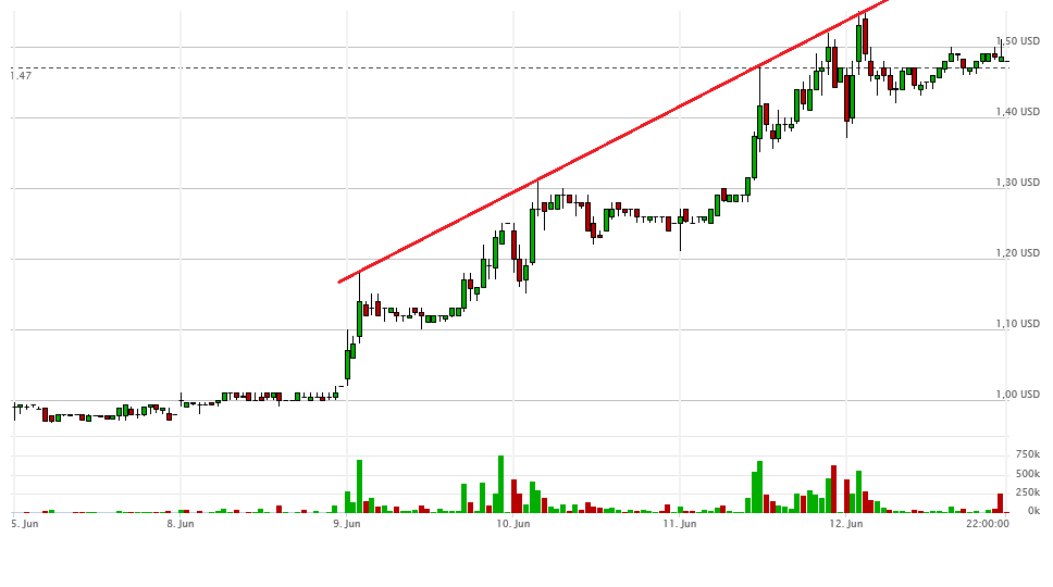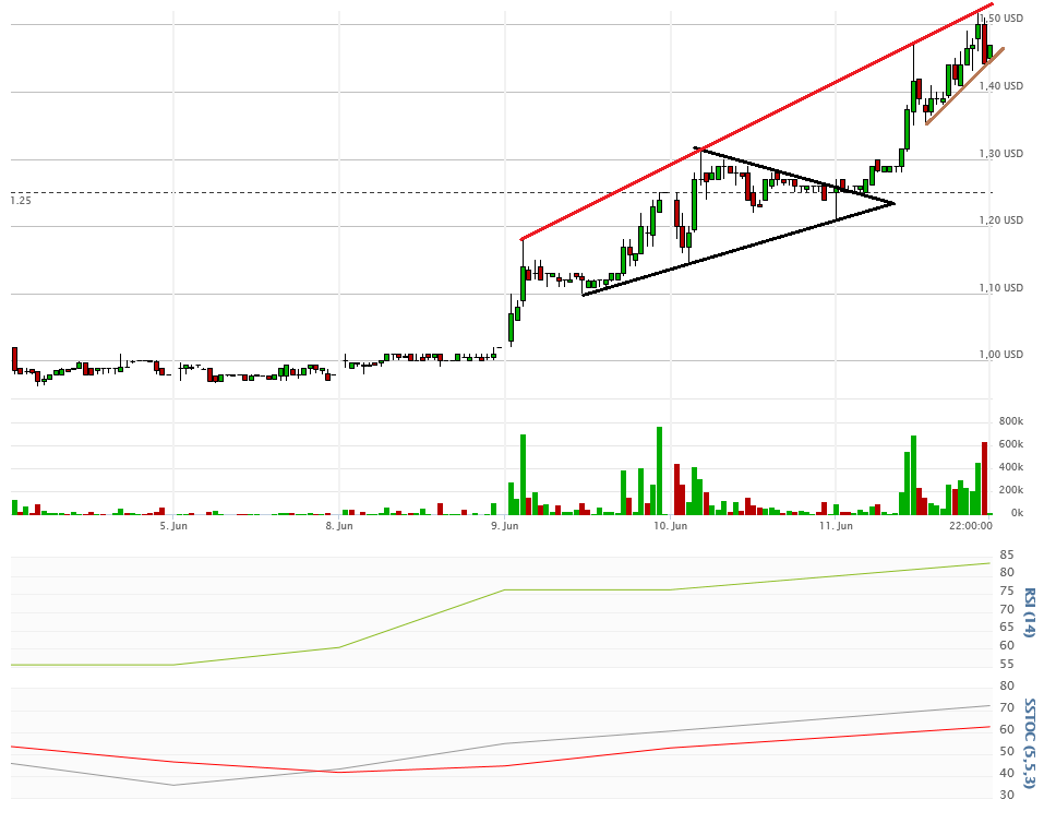 Zu Beginn des Handels wurde das Dreieck nach oben verlassen, und schon ging die Post ab. Bis auf 1,52$ lief die Aktie durch, Schlusskurs 1,47$ bei extrem hohem Volumen von etwa 5Mio Aktien.