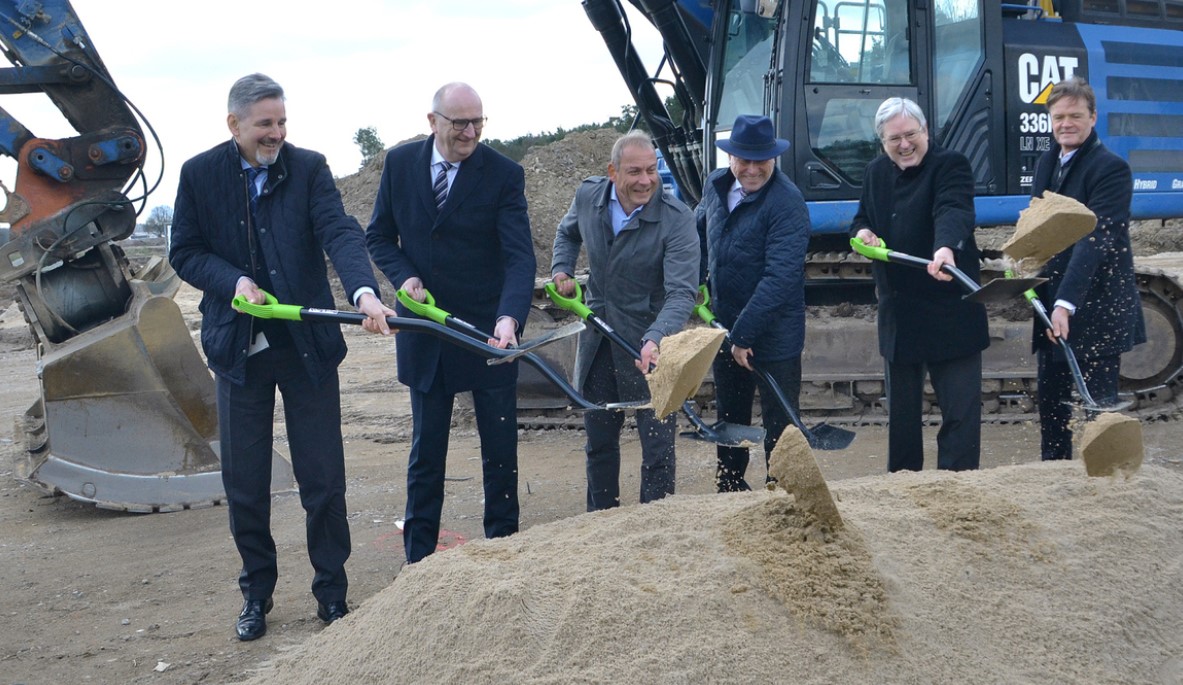 Führten den ersten Spatenstich für den Lithiumkonverter in Guben aus: Steffen Kammradt, Geschäftsführer der Wirtschaftsförderung Land Brandenburg GmbH, Ministerpräsident Dietmar Woidke, Rock-Tech-Chef Dirk Harbecke, Gubens Bürgermeister Fred Mahro, Brandenburgs Wirtschaftsminister Jörg Steinbach und Markus Schäfer, Vorstandsmitglied bei Mercedes-Benz