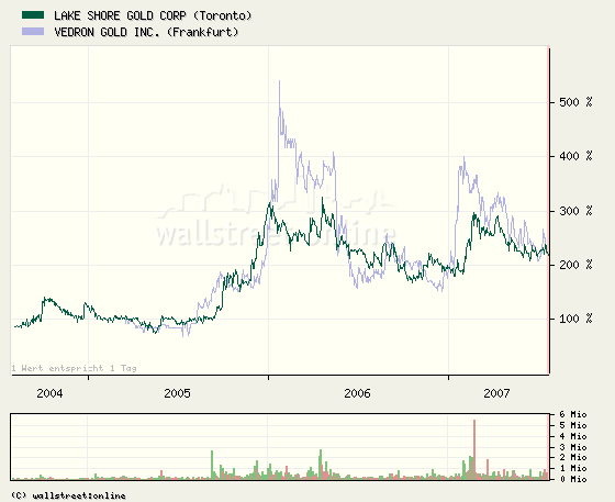 Habe mir mal eben schnell ein paar Daten aus der Investor Presentation von Lake Shore Gold durchgelesen. Wenn man nicht nur die nachgewiesenen Resourcen, sondern auch die noch offenen Projekte betrachtet, so sind die schon locker bei 2 1/2 Millionen Unzen Gold. Da wird unsere VG Gold Corp aber im Jahr 2008 sicherlich auch hinkommen. Außerdem hat Lake Shore Gold 40 Millionen kanadische Dollar in der Kasse und wir 5 Millionen. Unter Berücksichtigung dieser ganzen Details sind Lake Shore Gold und unser Unternehmen in etwa gleich "fair" bewertet.