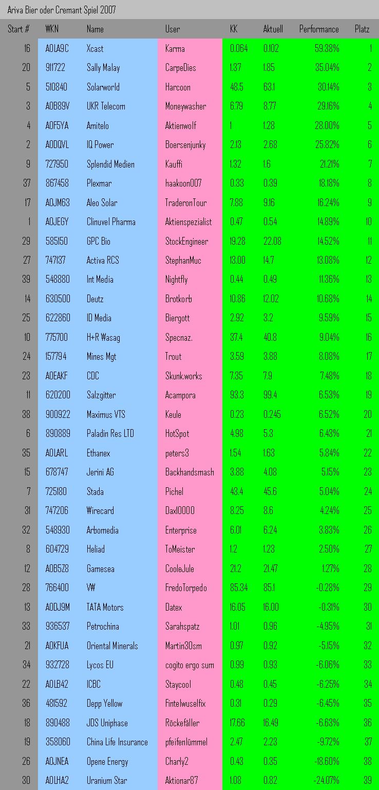 Hab leider erst heute von diesen doch recht interessanten Threat erfahren, muss zu meiner Schande gestehen, dass ich seit nem guten halben Jahr nicht mehr bei Ariva war... zu viel Arbeit und keine Zeit um in Ruhe zu lesen.. da ich euch aber nicht vollheulen will.. mal nen kurze frage an den "Erzeuger" des Threats: Darf man eventuell noch mit nem Tipp einsteigen der außerhalb der Wertung läuft?? Wird wohl eh nicht der Gewinner aber wenn es klappen sollte kann ich einmal sagen: "haha, ich hab's ja gleich gesagt!"