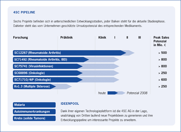 Das Management berichte nun im vorgelegten Zwischenbericht per 31.03.2008 darüber, dass eine designidentische, vertiefende Phase-2-Studie mit SC12267 auf die Indikation RA - und zwar als Monotherapeutikum - und eine Phase-2a-proof-of-concept-Studie mit der gleichen Substanz gegen entzündliche Darmerkrankungen initiiert worden sei. Ziel sei es, die Verwertungsoptionen deutlich zu erweitern, in beiden Indikationen keine Zeit zu verlieren und so die Verhandlungsposition deutlich zu stärken. Parallel verhandle man also weiter. Die entscheidende Frage laute, ob es sich um eine wertreduzierende Verzögerung oder um eine wertschaffende Optimierung handle.