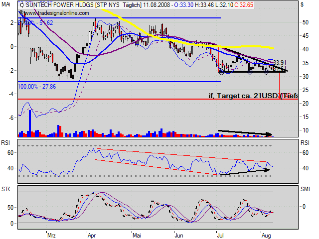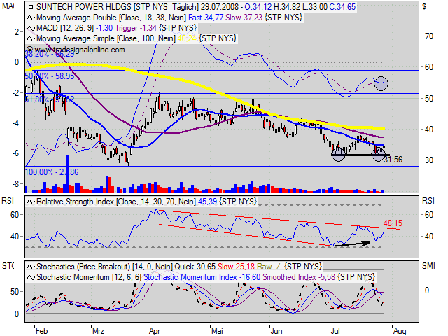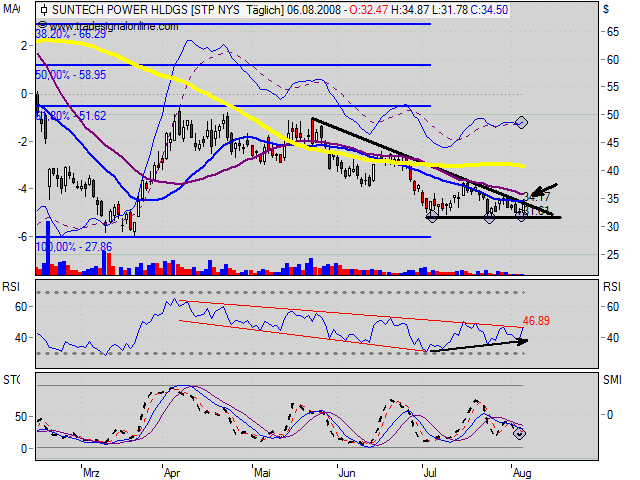 Die gute Positionierung und der Silizium-Impulse sind Faktoren, die sich im Kurs noch nicht widerspiegeln: Suntech ist niedriger als die Peergroup bewertet. Die Chancen stehen daher bestens, dass die Aktie den charttechnischen Seitwärtstrend zügig in Richtung Sonne verlässt.