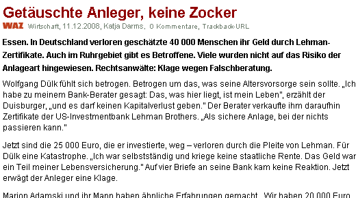 Allerdings ist der WAZ-Articel auch schon etwas ÄLTER; er stammt nämlich schon vom DONNERSTAG (11.12.2008)! - Erst SPÄTER scheint sich in vielen PRESSE-Organen der heute weit verbreitete DUMM-Sprech durchgesetzt zu haben, nach welchem die von ihrer jeweiligen HAUS-Bank (und NICHT von Lehman) getäuschten Anleger gleichwohl als "LEHMAN-Geschädigte" oder gar als "Lehman-OPFER" apostrophiert werden müssen.