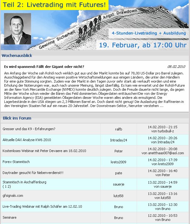 die folgende Seite ist recht nützlich ... die bieten immer wieder Live-Trading-Seminare an, was zum anfang durchaus Sinn machen könnte... der Gründer der Seite ist ein Bekannter aus sehr alten Tagen von mir, der über Geldanlage durchaus genügend Geld gemacht hat, seinem Hobby zu frönen ....