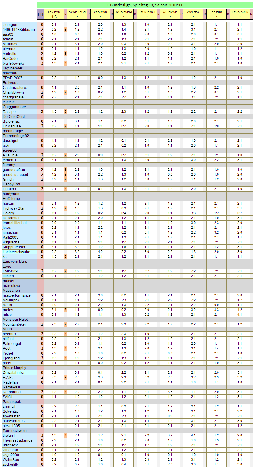 die erste Zwischenauswertung 2011.. heisan noch minimalst vorne, aber bisher am 18.Spieltag 0 Punkte!! Die Verfolger rücken heran.. Al Bundy mit den größten Chancen auf die Tabellenführung.. Da kann er dann gleich wieder die Tabelle ausdrucken.. *g*