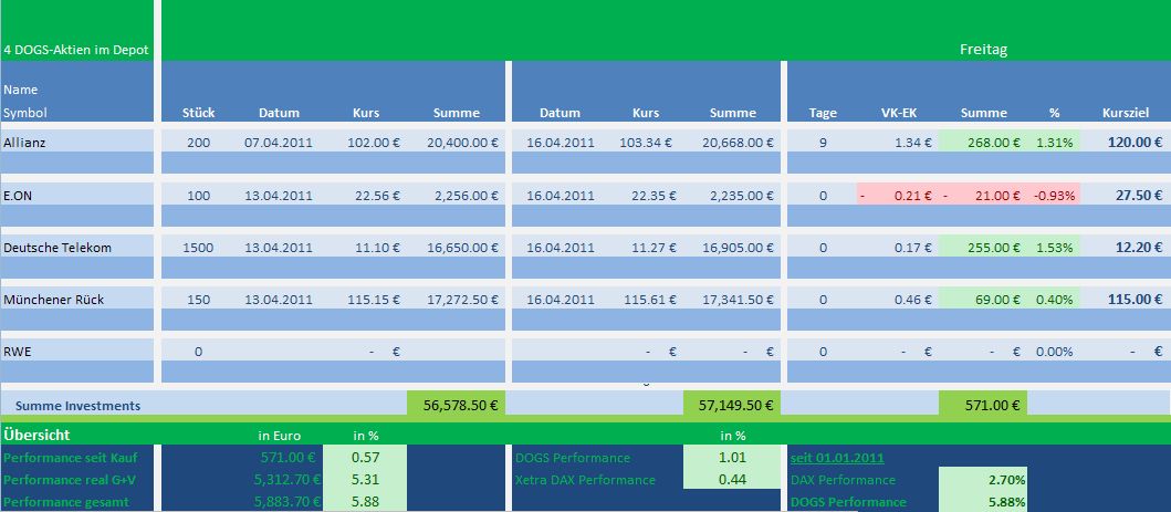 DOGS entwickeln sich erwartungsgemäss Wie bereits erwähnt sind heute Telekom, E.ON und MÜnchener Rück ins Depot genommen worden. Allianz ist schon länger wieder dabei und entwickelt­ sich gut.