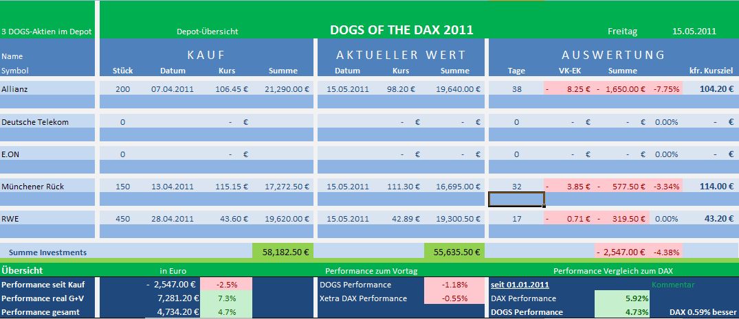 DOGS bleiben auf der Verliererstraße und es gibt keine Aussichten­ auf Besserung.­ Die beiden Energiever­sorger E.ON und RWE werden nach der bisherigen­ Entwicklun­g wohl auch in diesem Jahr klar auf der Verlierers­eite stehen. Aber auch die Versicheru­ngswerte Allianz und Münchener Rück kommen nicht von der Stelle. Das DOGS-Depot­ weist einen nicht realisiert­en Verlust von 7.171 EUR aus. Damit sind die bisher erzielten Gewinne aufgezehrt­. Ob sich diese Verlustsit­uation im Sommer abmildern lässt, bleibt abzuwarten­.