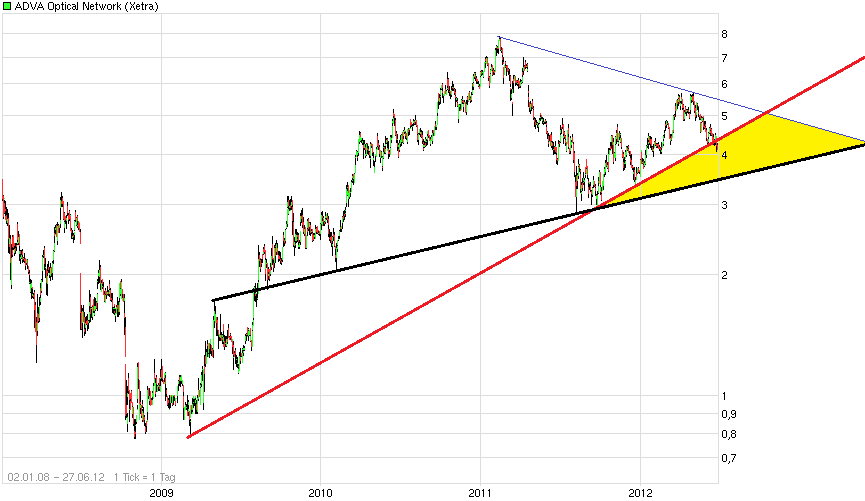 28.06.2012 Chart-Check ADVA Optical: Nächste Unterstützung im Fokus -http://www.deraktionaer.de/aktien-deutschland/chart-check-adva-optical--naechste-unterstuetzung-im-fokus-18374829.htm => "...Der Abverkauf von ADVA Optical setzte sich auch in den letzten Handelstagen fort. Aktuell notiert der Kurs im Bereich der 4-Euro-Marke. Dort verläuft eine weitere wichtige horizontale Unterstützungslinie. Rutscht das Papier auch noch unter diese Marke, droht ein weiterer Abverkauf bis 3,50 Euro. Für neue Impulse könnten die Quartalszahlen sorgen, die am 19. Juli veröffentlicht werden. ....Aufgrund des schwachen Chartbilds sollten Anleger vorerst die Finger von ADVA Optical lassen und eine Bodenbildung bzw. die Reaktion der Aktie auf die Zahlen für das zweite Quartal abwarten.