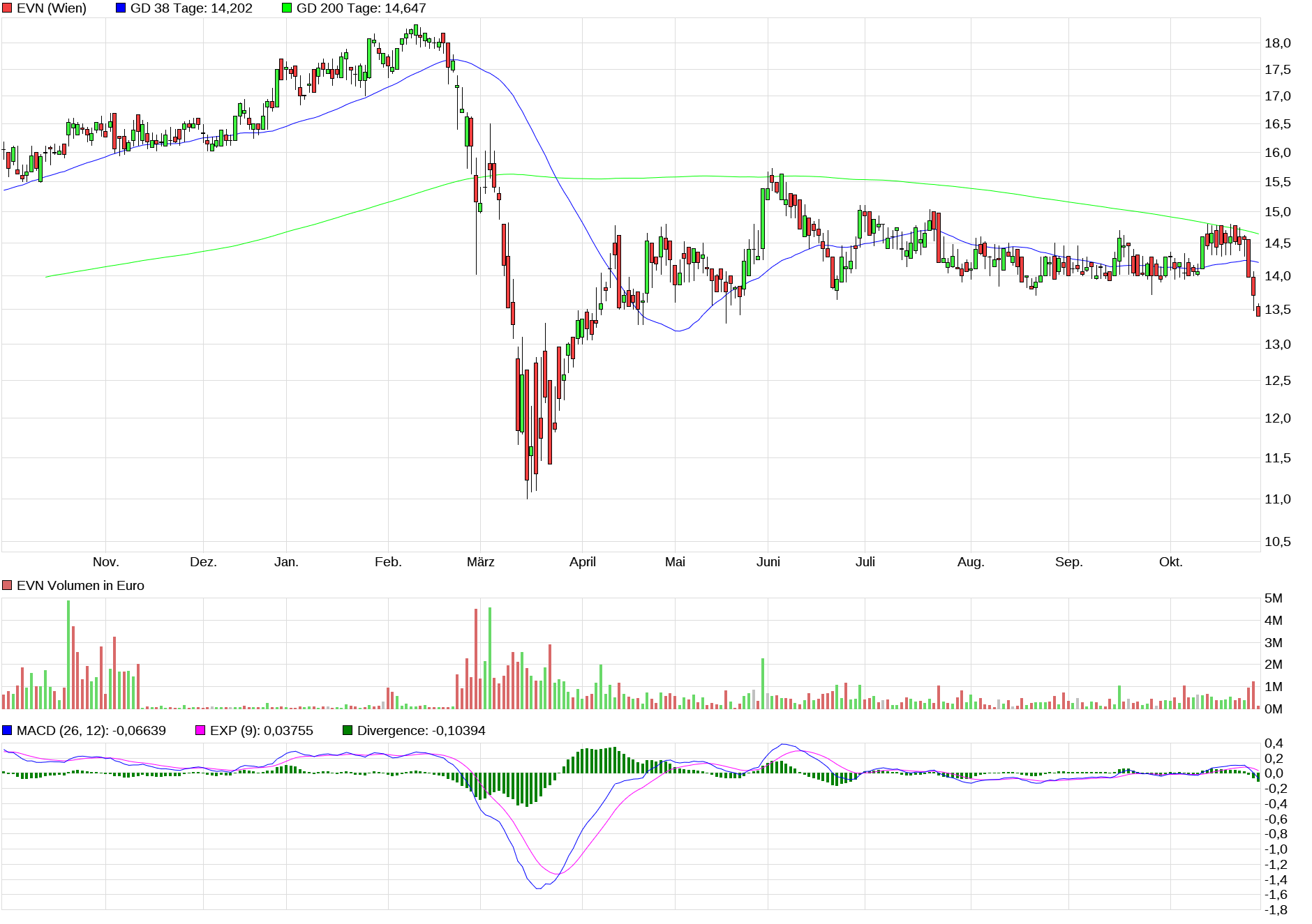 Leider hängt EVN auch allein an der Verbund-Aktie. Wenn die fällt, fällt auch EVN. Technisch macht es eigentlich erst wieder Sinn, wenn man über 14,8 ausbricht. Antizyklisch entweder jetzt bei 13,4 einsteigen, aber wenn es unter 13,3 geht, muss man auch Kurse nahe der Märztiefs auf der Rechnung haben.
