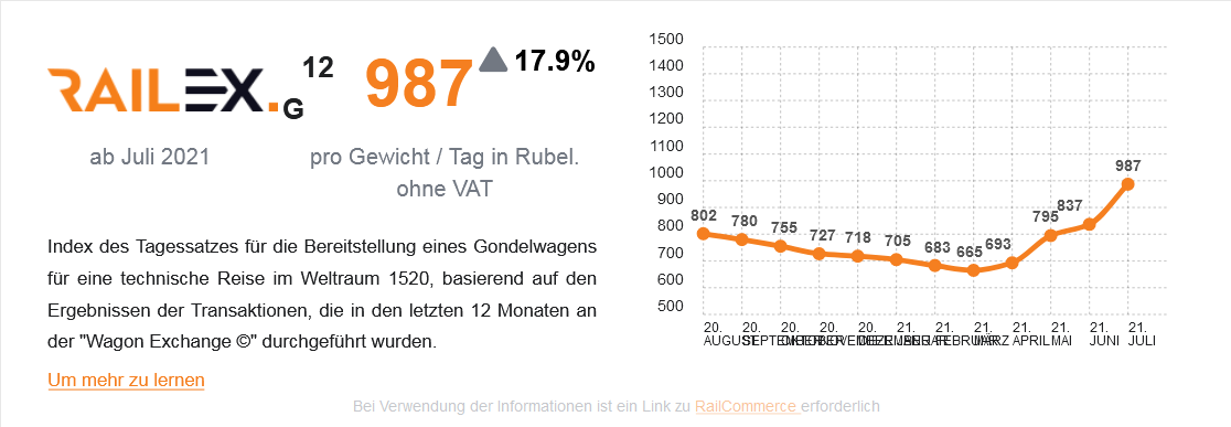 Die Betreiberpreise für Gondelwagen überschritten im Juni die Grenze von 1200 Rubel pro Tag. Der im April begonnene Preisanstieg für Gondelwagen und Spezialflotten hat sich im Mai und Juni stark beschleunigt. Wachstumstreiber der Raten war vor allem ein Anstieg der Verladung von Kohle und inerten Baustoffen. Auch die Inflation spielte eine Rolle. Diese Dynamik wird nach Prognosen der Betreiber bis in den Herbst andauern, über einen langfristigen Trend muss aber noch nicht gesprochen werden.