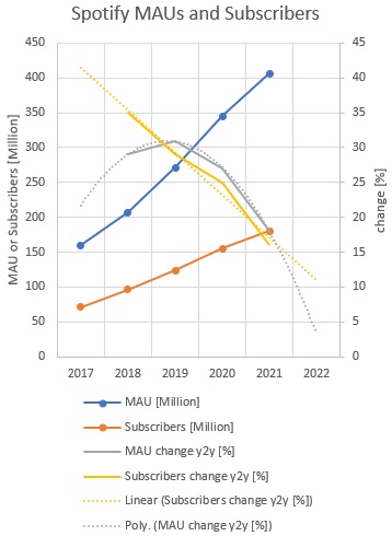 Abgesehen von der aktuellen technischen Analyse und positiven Kaufsignal mache ich die Beobachtung einer relativen Interessenssenkung gegenüber Spotify, siehe Grafik der MAUs- und Subscribers-Entwicklung über die Jahre. Sogar in meiner Privatumgebung haben Leute für einen oder anderen Grund die Abo gekündigt.