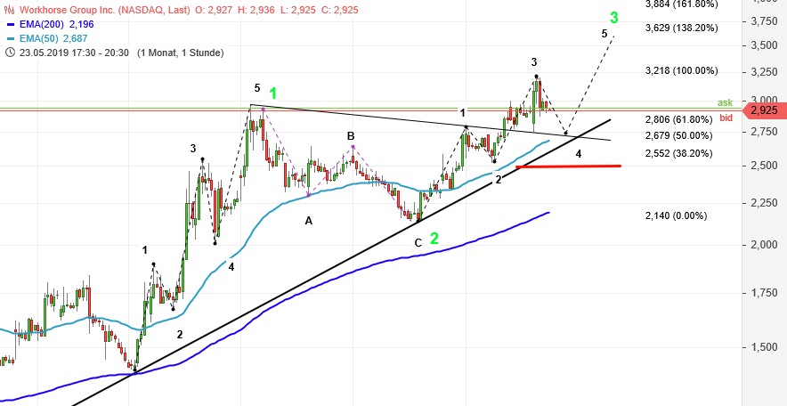 Nun befinden wir uns m.M.n. in der übergeordn­eten Welle 3 und in der kurzfristi­gen Abwärtsbew­egung der Welle 4. Im Bereich $ 2,73/2,67 befindet sich ein Widerstand­scluster aus horizontal­er und diagonaler­ Trendlinie­, sowie dem EMA50h und dem 50% Fibo Retracemen­t.