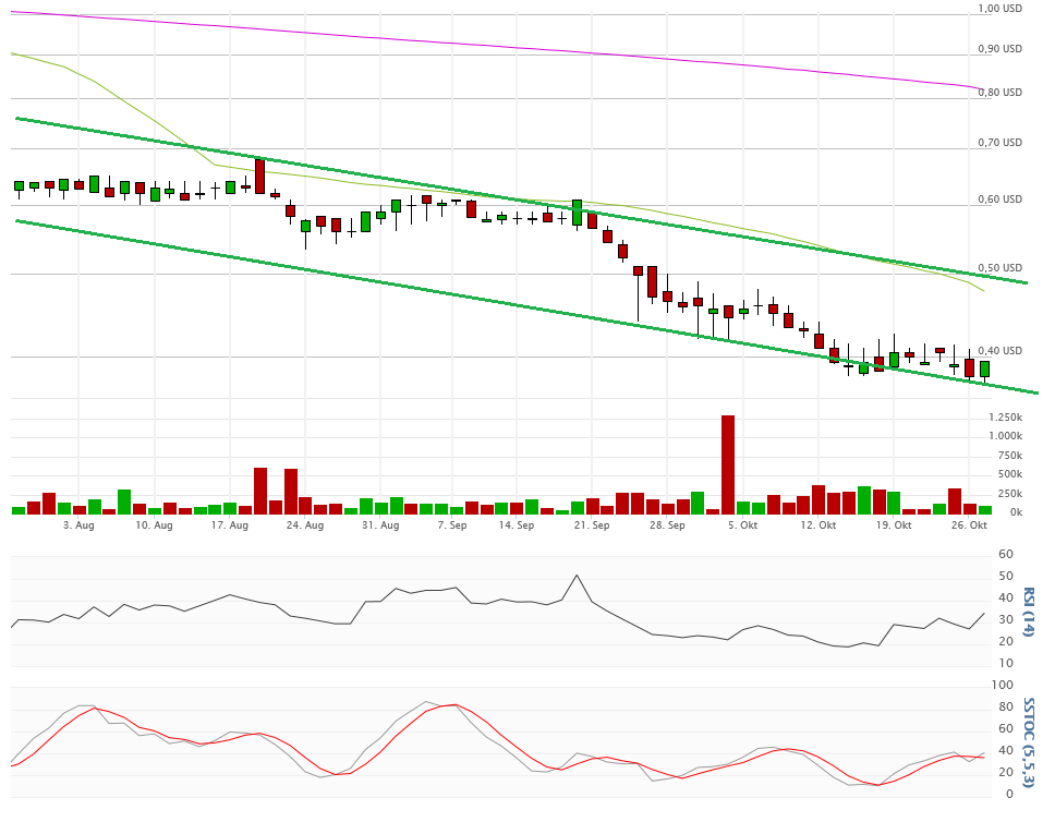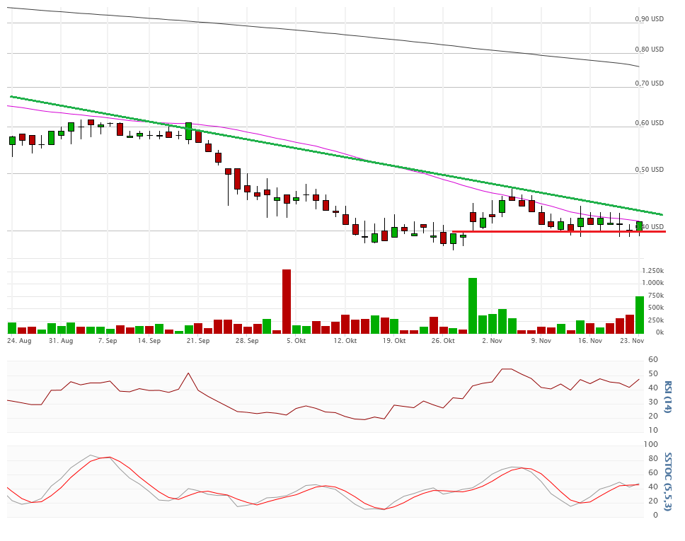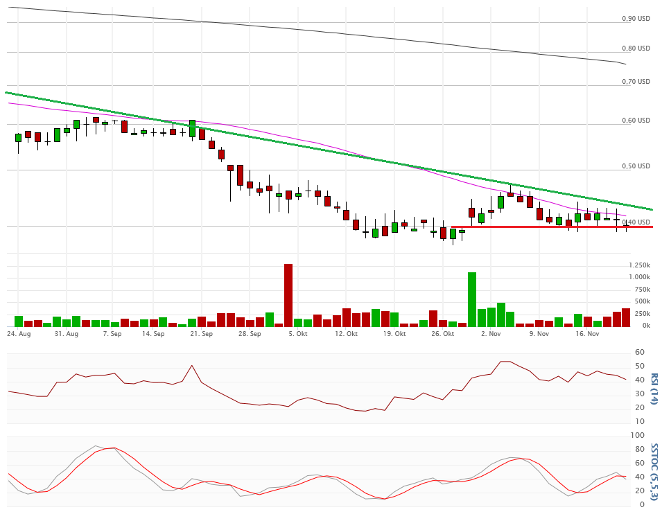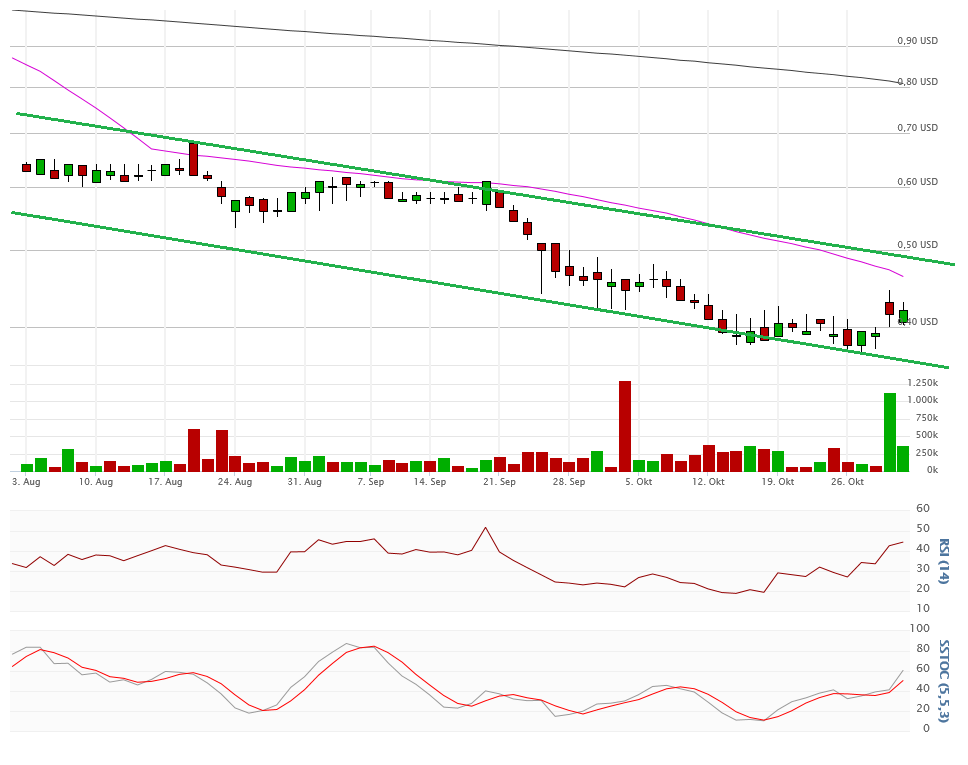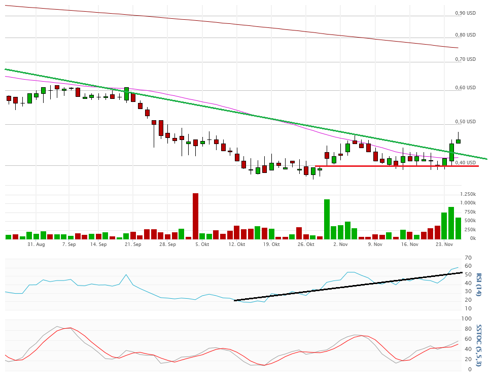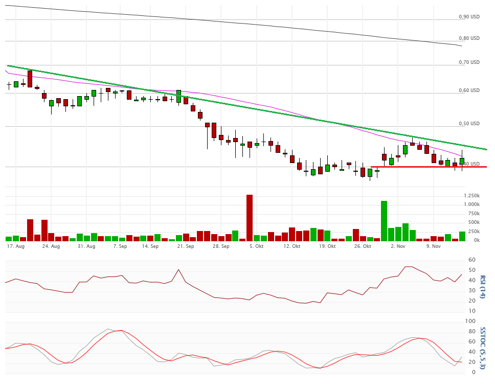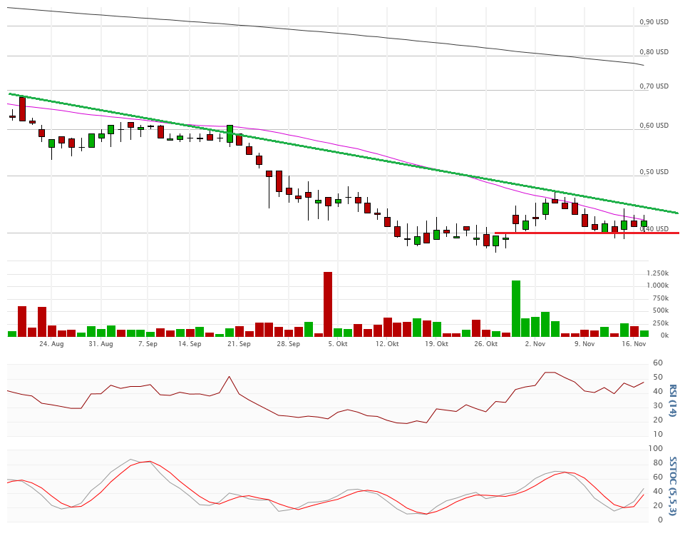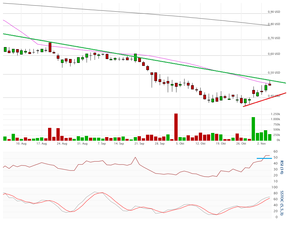 Mit 0,415$ schloss die Aktie gestern exakt auf der 38-Tage-Linie. Kann sie heute endlich per Schlusskurs überwunden werden?