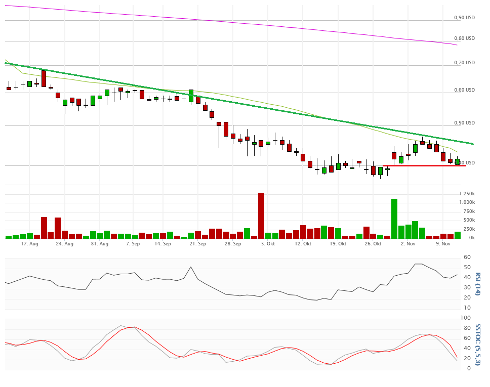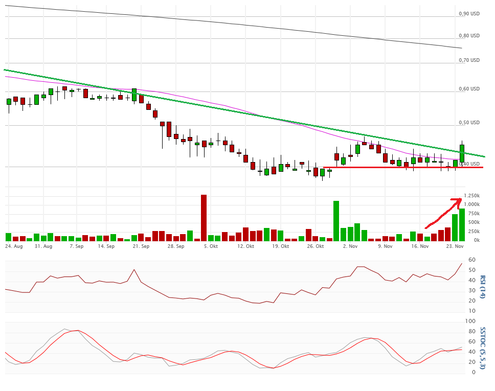 Unten hat mit dem Tagestief von 0,40$ die Unterstützung gut funktioniert. Mit hohem Volumen ging es dann über 0,43$, hier verlief heute die Abwärtstrendlinie, bis auf 0,46$. Dann der Retest des Ausbruchs mit dem Rücksetzer auf 0,43$. Am Ende bleibt 0,45$ stehen, Volumen über 900000 Aktien.