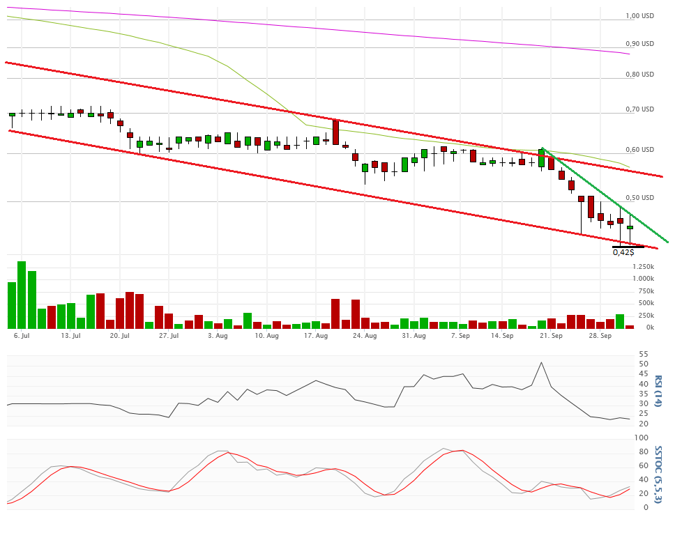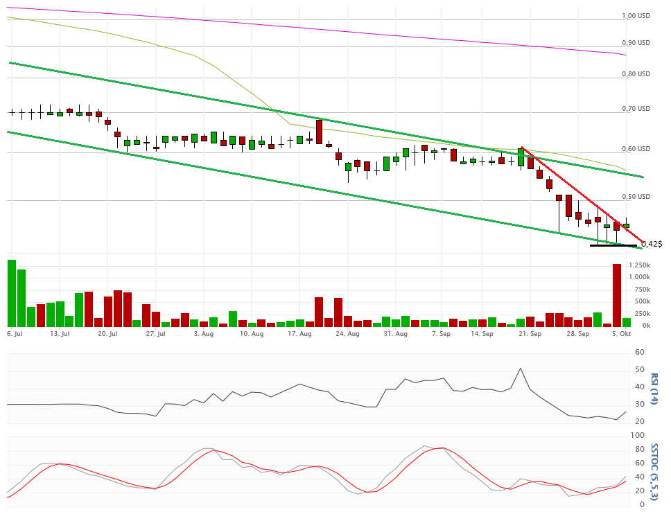 An den letzten beiden Tagen haben wir mit 0,42$ mal wieder ein neues Allzeittief gesehen. Zum Glück drehte hier der Kurs wieder nach oben um, sodass der Abwärtstrendkanal nicht nach unten aufgelöst wurde.