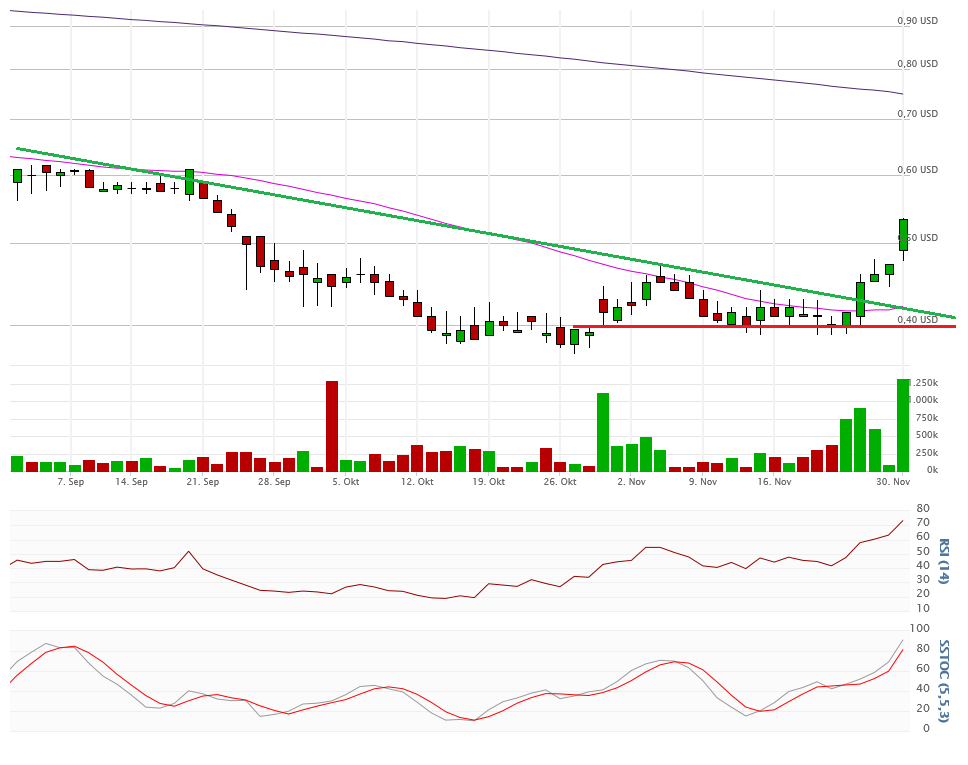 Charttechnisch wurde also alles gesagte bestätigt. Die Unterstützung bei 0,40$ konnte per Schlusskurs stets verteidigt werden, wenn auch knapp. Aber knapp dabei ist auch dabei. Dann konnte an einem Tag mit hohem Volumen nicht nur die 38-Tage-Linie, sondern auch die mehrmonatige Abwärtstrendlinie übersprungen werden. Das war der Grundstein für die aktuell deutlichere Erholung.