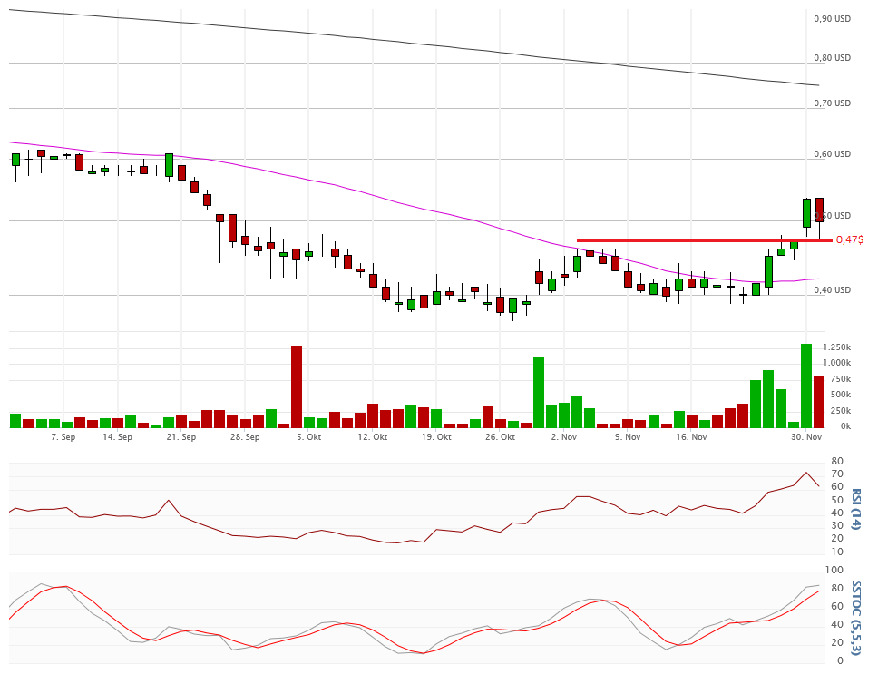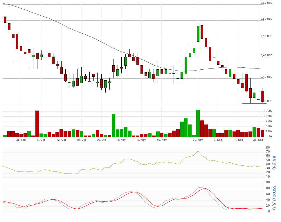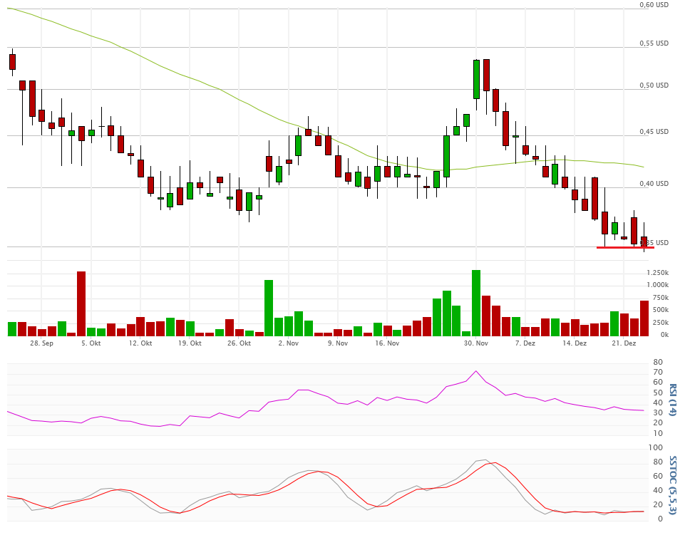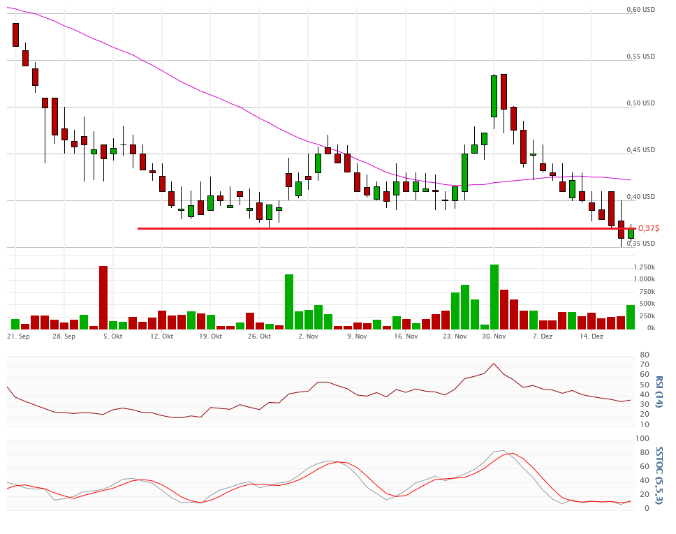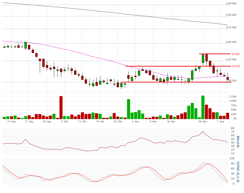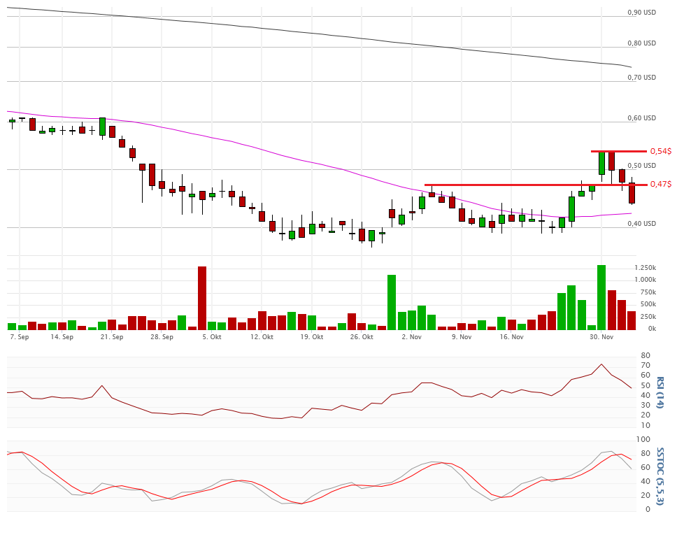 Der Bruch der Unterstützung bei 0,47$ wurde am Freitag bestätigt. Damit ist der Rebreak ausgefallen. Als Tagestief wurde die 38-Tage-Linie auserkoren. Schlusskurs 0,45$.