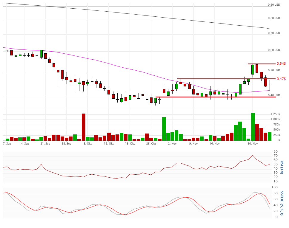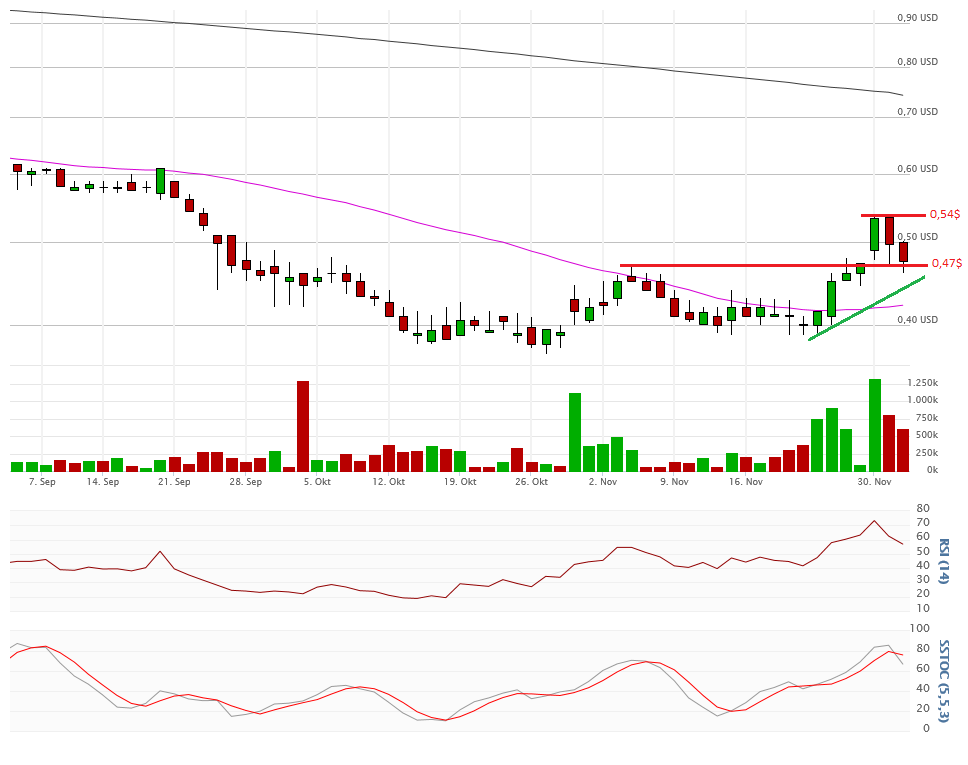 Die Unterstützung bei 0,47$ ist gefallen - oder doch nicht? Zwar wurde gestern ein Schlusskurs von 0,44$ produziert, aber im heutigen Anfangshandel steht die Aktie schon wieder bei 0,47$. Gelingt ein direkter Rebreak, bliebe die Unterstützung intakt. Und der Deckel bei 0,54$ kann wieder angegriffen werden.