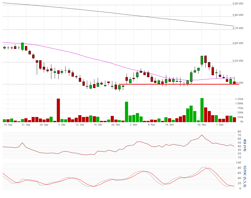 Zum Wochenschluss geht die Aktie bei 0,40$ aus dem Handel, exakt an der Unterstützung. Man darf gespannt sein, ob der Kurs wieder drehen wird. Die Marke ist extrem wichtig.
