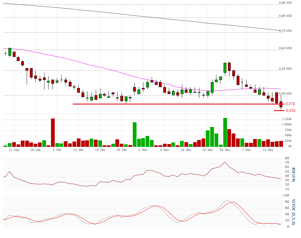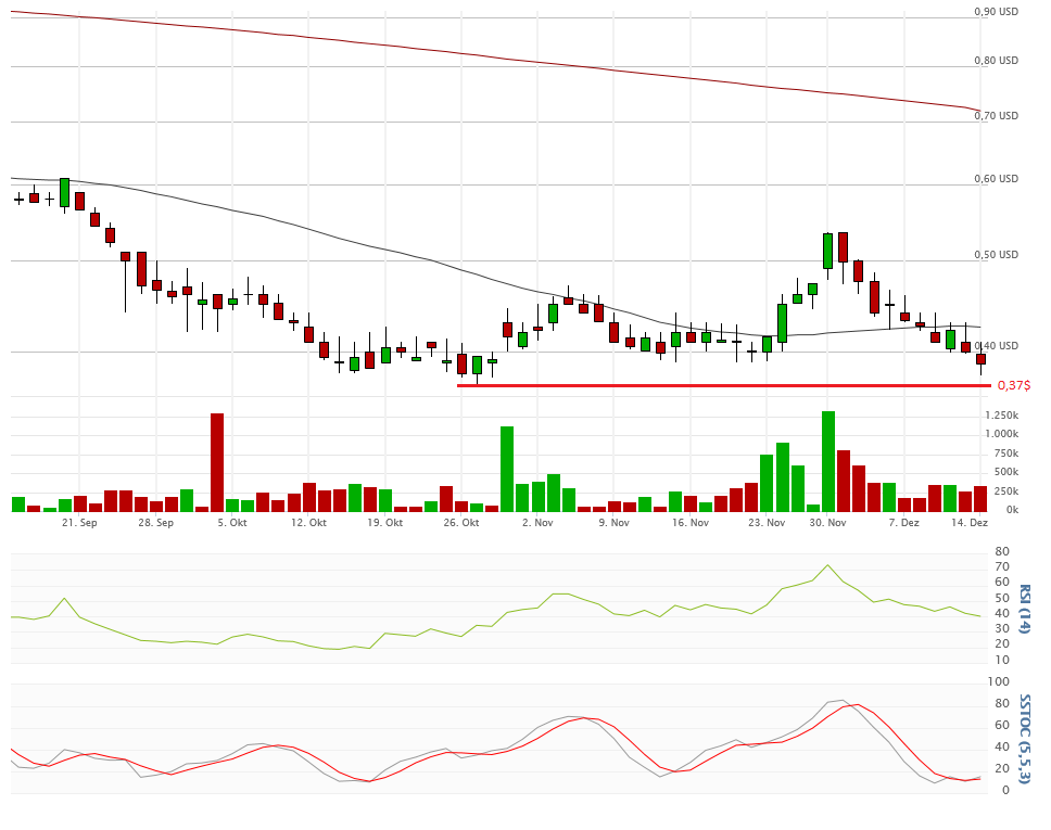 Gestern haben wir im Prinzip das Allzeittief bei 0,37$ wieder gesehen. Weniger als ein Cent Differenz war noch auszumachen. Schlusskurs 0,39$. Die Unterstützung bei 0,40$ wackelt bedrohlich. Endgültig gefallen ist sie aber noch nicht.