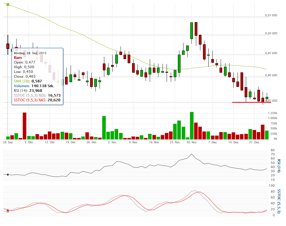 Wie 2015 geendet hat, so beginnt das Jahr 2016, mit einem hochprozentigen Kursgewinn. Schlusskurs 0,453$, +10%.