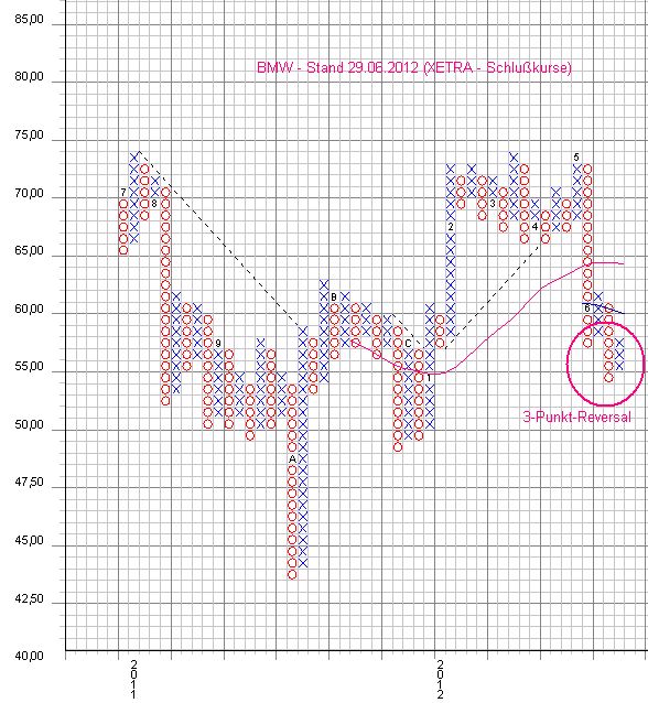 P&F charttechnisch gab es in der Tat in den vergangenen Tagen einen 3-Punkt-Reversal. Allerdings befindet sich der Gesamtmarkt im überkauften Bereich. Immerhin waren 96% der DAX-Einzelwerte gestiegen. Somit ist der 3-Punkte-Reversal unter Berücksichtigung der Gesamtmarktentwicklung kein wirkliches Stärkezeichen. Dennoch sollte man sich diese Entwicklung auch unter Relative Stärke Aspekt und die Entwicklung im Branchentrend verstärkt beobachten.