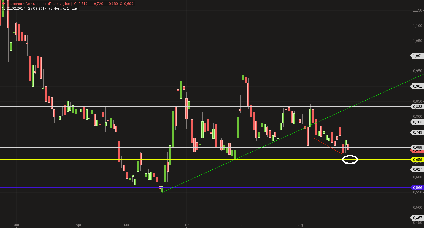 Es gab einen Aufwärtstrend (grün) der wurde durch einen kleinen Abwärtstrend (rot) abgelöst und sollte bei 0,659 € (gelb) stoppen. Geht es drunter, wären die 0,56 € das Ziel. Hier könnte man Nachkaufen. Wer keine Geduld hat auf die Gewinne der Firma zu warten, sollte spätestens da raus.