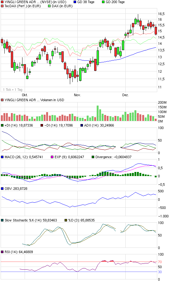 Charttechnischer Ausblick: Der Druckaufbau der letzten Tage sowie der letzten Monate könnte sich nun nach oben hin entladen, ein Kaufsignal wird jetzt möglich. Gelingt der Yingli Green Energy Aktie ein nachhaltiger Ausbruch über 16,35 $, sollte es zu weiterem Kapitalzufluss und steigenden Kursen bis 22,00 - 23,00 und auf mittelfristige Sicht 41,50 $ kommen.