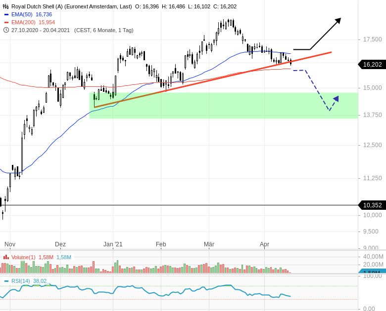 "Die robuste Ölpreisentwicklung spielt dem Konzern aktuell deutlich in die Karten, das Gerichtsurteil belastet jedoch. DER AKTIONÄR bleibt für die Aktie von Royal Dutch Shell mittel- bis langfristig aber zuversichtlich gestimmt. Anleger können bei der günstig bewerteten Aktie weiterhin an Bord bleiben. Der Stoppkurs sollte bei 13,60 Euro belassen werden."