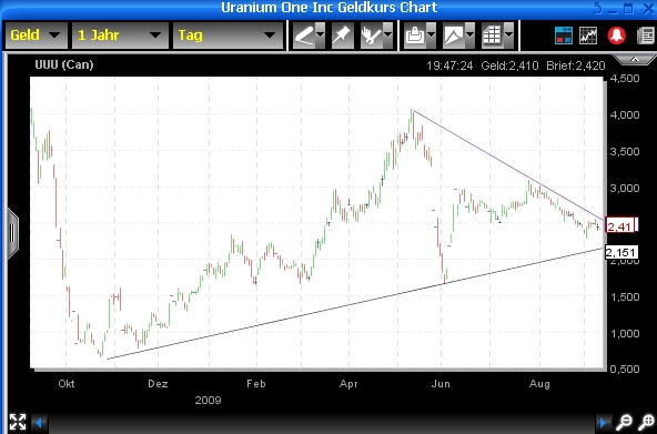 neben Uranium Energy, Denison Mines und Paladin ( alles Uranwerte ) Uranium Energy (UEC) könnte ein sehr dicker Brummer werden... jede Korrektur wird anscheinend sofort zum Kauf genutzt.