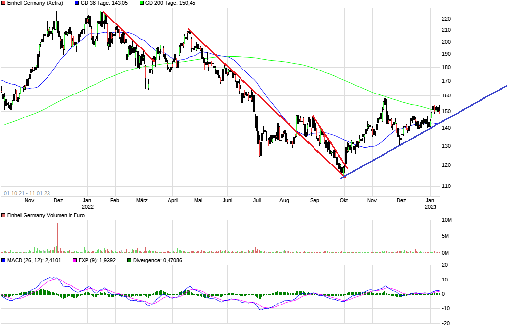 Aber gut, vom Chart her könnte es noch 3-4 Wochen seitwärts zwischen etwa 143 € und 156 € gehen, bevor es dann irgendwie in eine Richtung aufgelöst werden muss.