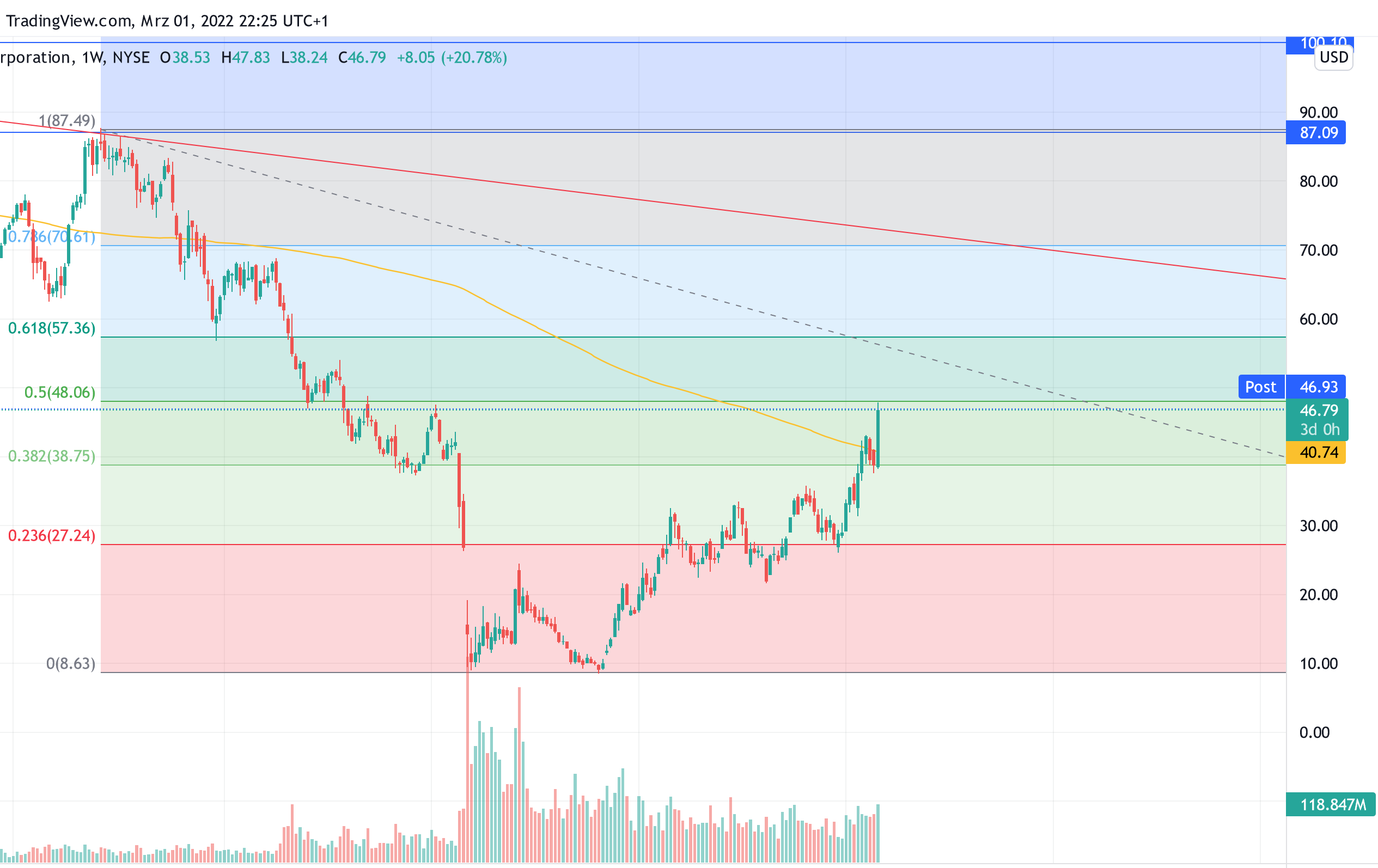 wenn der durch die 0,5 Fib (47,83$)durchbricht. Vermute eher, dass man noch mal Luft holt bist um die Untersützungszone bei 43-44,5$, um dann über die Fib zu hopsen. Mal schauen, ob es so sein wird. Wenn wir drüber kommen, haben wir erst mal freie Bahn bis 54$, wenn wir die psychologischen 50$ ausnehmen.