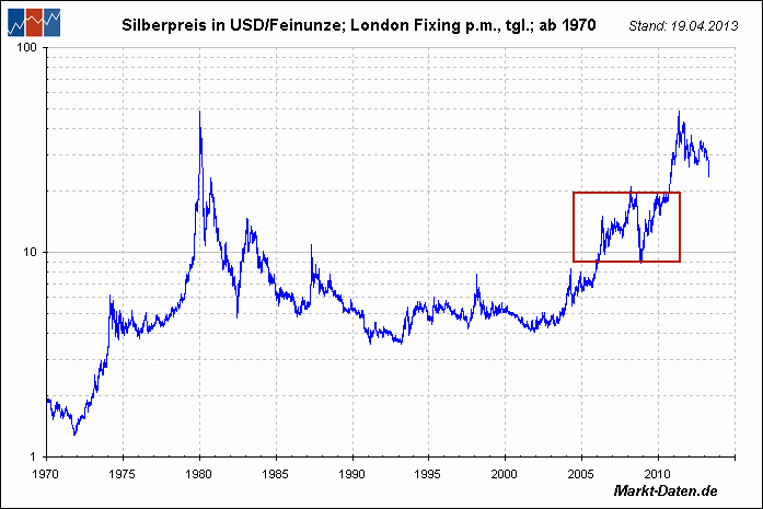 Was Gold und Silber angeht, so sieht die Sache vollkommen anders aus. Sicher haben sich da von den Höchstkursen aus betrachtet erhebliche Kursverluste eingestellt. Nur gab es die im gleichen Zeitraum und in gleicher Höhe (oder noch schlimmer) auch bei durchaus honorigen und kerngesunden DAX-Unternehmen, ohne dass da jemand was von einer Blase erzählen würde. Und so sehen das dann die Anleger auch: es hat eine heftige Kurskorrektur gegeben, aber kein Anzeichen einer Blase.
